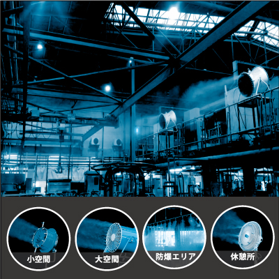 全国の現場に豊富な実績 【01】大規模空間を冷房可能 【02】現場を濡らさず冷房 【03】優れた省エネ性耐久性 ※現場に最適な冷房システムをご提案します。