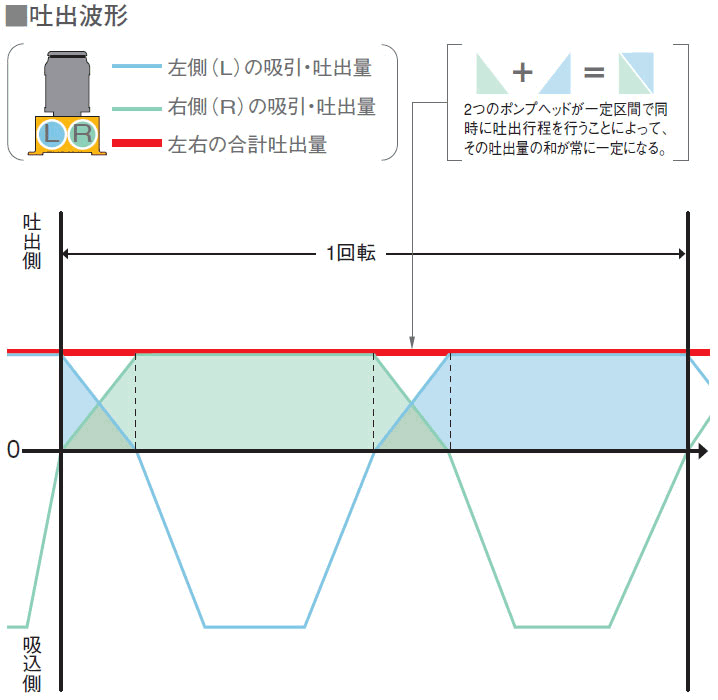 左右両ポンプヘッドの吐出量の和を一定にすることで、定量連続流を実現しました。 |