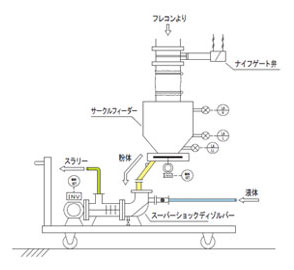 粉体溶解ポンプ(スーパーショックディゾルバー)を応用した、粉液を連続的に混合溶解するシステムです。