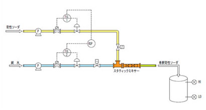 高濃度の苛性ソーダをインラインで希釈して、一定濃度の苛性ソーダを連続して生産します。硫酸希釈システムと同様、工業用の基礎薬液を調合製造するシステムです。