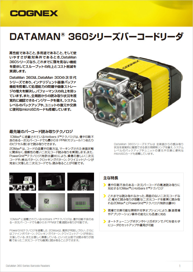 業界で高い評価を得ている「DataMan® 300/360 シリーズ」は、最も多様性の高いコグネックスの固定型バーコードリーダで、複数の内蔵照明とレンズオプション、インテリジェントチューニング機能を搭載し、複数のモデルから選ぶことができます。DataMan 300/360 シリーズは、最も読み取りが困難な DPM(ダイレクトパーツマーク)コード、難しい一次元バーコード、二次元マトリックスコードをインデックスまたは高速ラインで処理することができます。