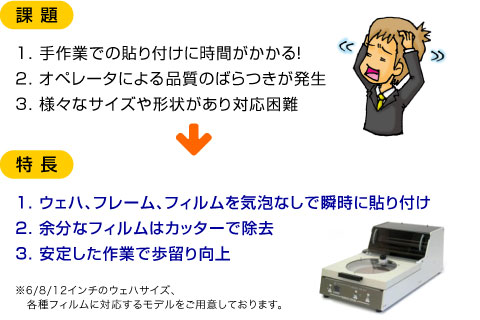ウェハ、ダイシングフレーム、テープを気泡なしで容易に貼り付ける装置