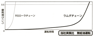 | RSローラチェーンと比べ摩耗伸び寿命が7倍以上に向上 だだし、RS-120-LMD-1、RS-140-LMD-1は摩耗伸び寿命が2.5倍です。 |