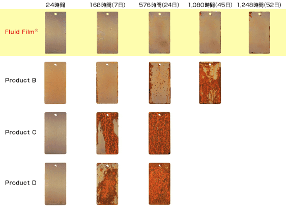 | 鉄板を縦に24時間後の状態をチェック。 → フルイドフィルムを噴霧したもの以外は鉄板の下辺方向に垂れ、下方の厚さが増し、上方の厚さが薄くなっている。 さらに、全ての鉄板に濃度5%の塩水を噴霧し、密閉された保管庫内に吊るし、各々の表面の腐食度が約95%になった時点で、鉄板を庫外に出す実験を実施。 → 結果、2社の鉄板(Product C及びProduct D)が、14日で95%の腐食に達し、Product Bは、45日目で95%の腐食。52日(1,248時間)後、フルイドフィルムを噴霧した鉄板の腐食割合は、わずか5%。 ※同様の試験結果が、米国ロサンゼルス市建設安全局よりレポートされている。 |