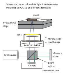 白色光干渉計は三次元表面計測のための最も効率的な手法の一つです。ピエゾアクチュエータは事実上制限のない高い精度と高速応答により、この白色光干渉計の精度と速度を大幅に向上させることができます。 piezosystem jena社の新製品MIPOS 16-158は、サブナノメートルの分解能をもつ光学システムの高精度ポジショニング用に特別に開発されています。MIPOS 16の高い分解能と高速応答性は干渉計の新たな可能性を導くものです。独自の設計を元に開発されたMIPOS 16-158は、開口104 mm、ステージ高さ42 mmで、白色光干渉計に最適な仕様を提供します。焦点距離は最大16μmまで、ステップ分解能0.1nm未満で、この場合の駆動電圧は-20~130Vです。計量・計測用のセットアップやデバイスへの組込みを想定して設計されています。 |