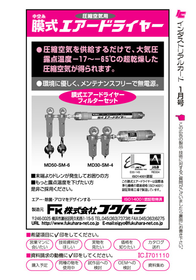コンプレッサーから送られる圧縮空気が、ドライセパレーターの中で発生するサイクロン(高速旋回気流)によって、空気より比重の重い不純物(水分、油分、微細物質等)を分離除去し、良質な圧縮空気を送出します。 湿度の高い日本での生産現場の必需品。空気圧応用機器に強い味方です。 ランニングコスト「ゼロ」 メンテナンスフリー 交換部品不要 電源不要 低価格