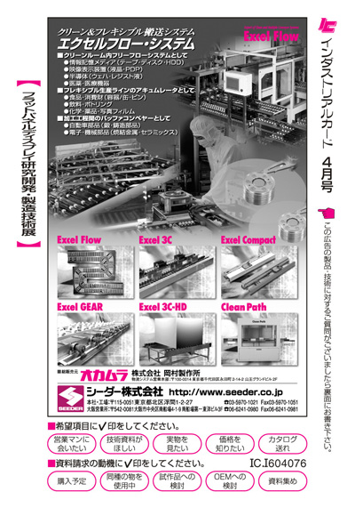 クリーン&フレキシブル搬送システム クリーンルーム内フリーフローシステムとして 情報記憶メディア(テープ・ディスク・HDD) 映像表示装置(液晶・PDP) 半導体(ウェハ・レジスト液) 医薬・医療機器 フレキシブル生産ラインのアキュムレータとして 食品・消費財(容器/缶・ビン) 飲料・ボトリング 化学・薬品・写真フィルム 加工工程間のバッファコンベヤーとして 自動車部品(鍛・鋳造部品) 電子・機械部品(焼結金属・セラミックス)