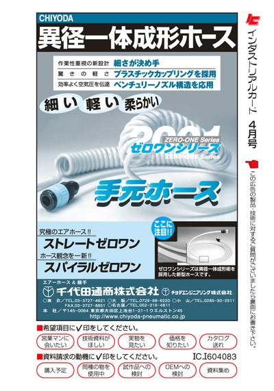 プラスチックカップリングを採用 驚きの軽さ 細さが決め手 作業性重視の新設計 ベンチュリーノズル構造を応用 効率よく空気圧を伝達 ゼロワンシリーズは異径一体成形術を採用した新型ホースです。