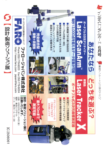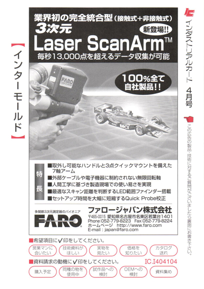 待望の非接触レーザースキャナー登場! Faro Laser Probeは、3D局面のサーフェイス上に簡単に点データを収集することができるパワフルな3Dデジタイザーです。Faro Armと併用する事により、複雑な形状のパーツをどのような方向からもデジタイジング可能です。測定器を移動する事なく三次元の面データを収集する事を実現しました。
