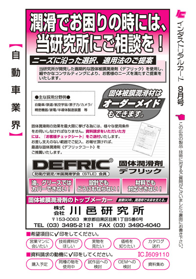ニーズに沿った選択、適用法のご提案 当研究所が開発した画期的な固体被膜潤滑材≪デフリック≫を使用し、細やかなコンサルティングにより、お客様のニーズを満たすご提案をいたします。
